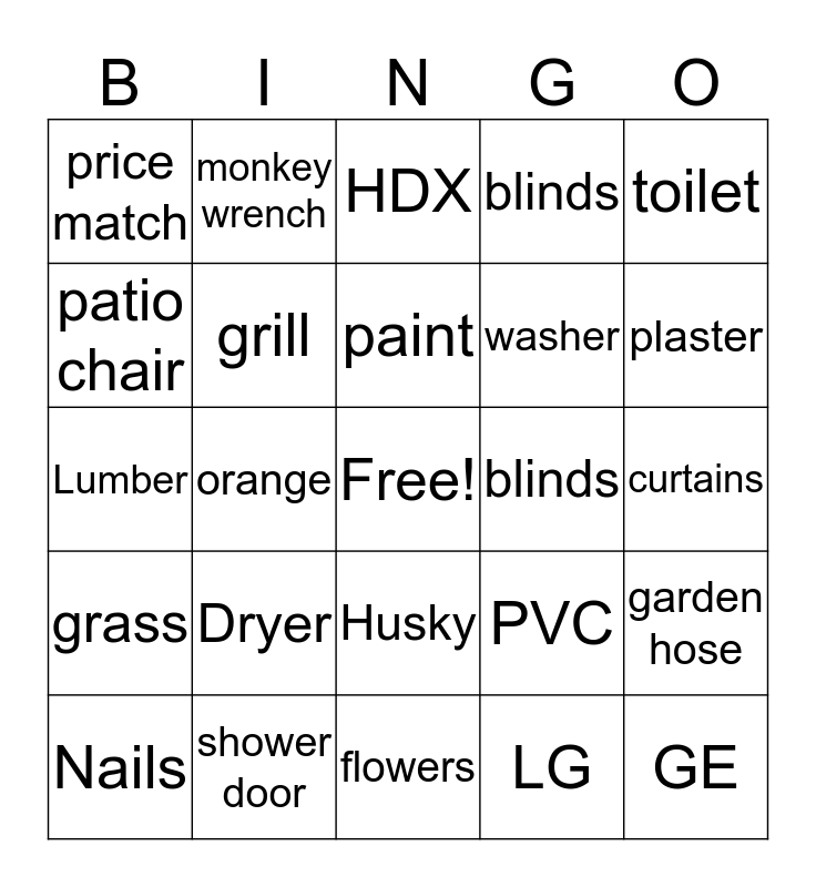 This bingo card has a free space and 24 words: Nails, Dryer, paint, LG, toilet, price match, monkey wrench, HDX, blinds, curtains, Lumber, grill, PVC, garden hose, patio chair, shower door, flowers, blinds, plaster, grass, orange, Husky, washer and GE.