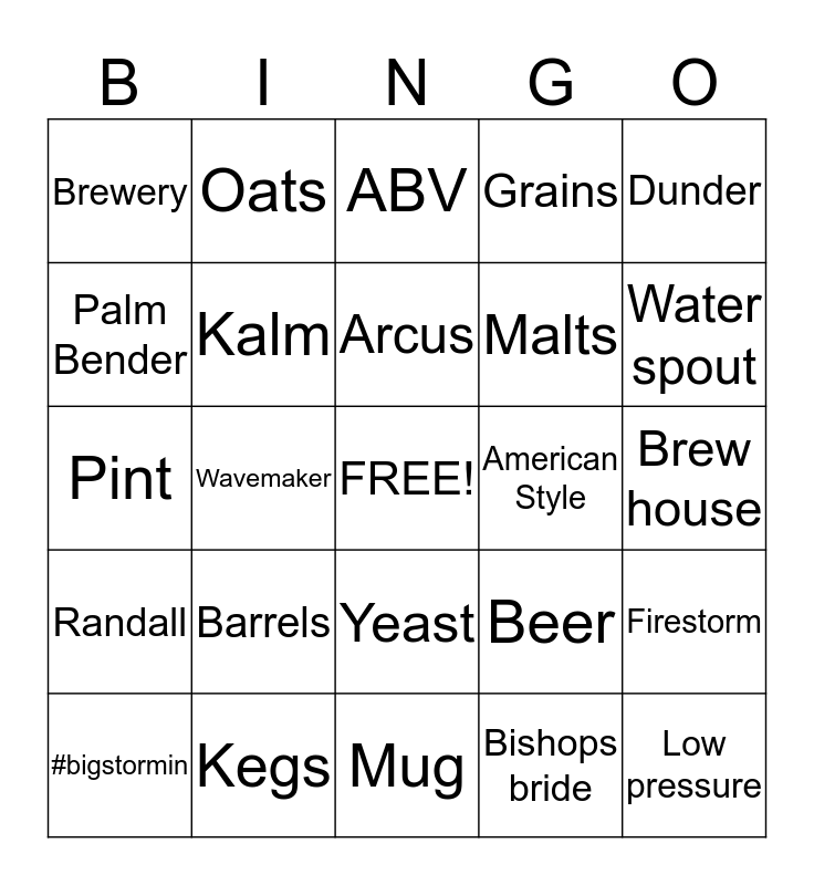 This bingo card has a free space and 24 words: Barrels, Kegs, Arcus, #bigstormin, Dunder, Brewery, Palm Bender, Oats, American Style, Yeast, Malts, Pint, Beer, Firestorm, Kalm, Bishops bride, Brew house, ABV, Water spout, Wavemaker, Low pressure, Randall, Grains and Mug.