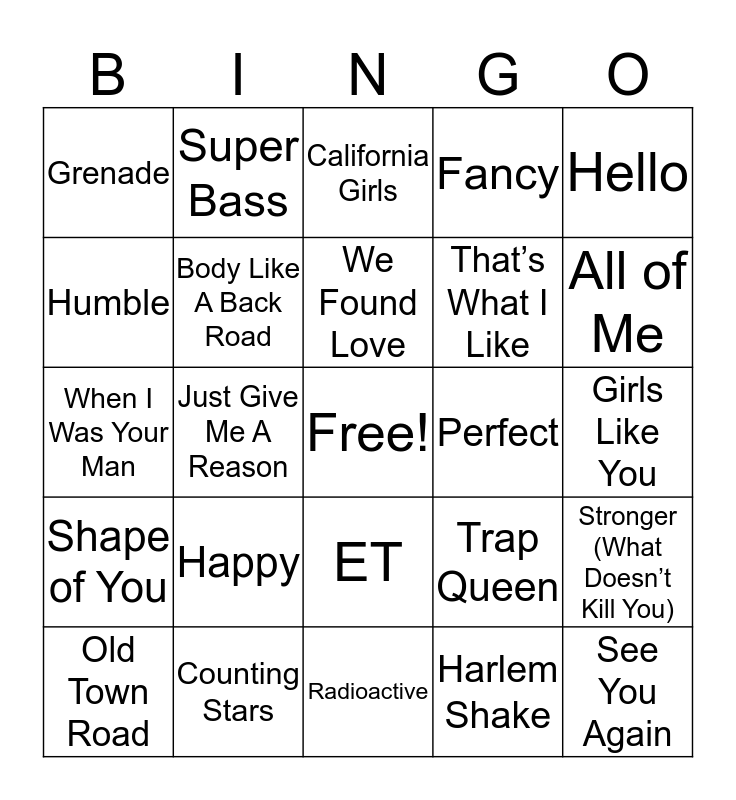 This bingo card has a free space and 99 words: Tik Tok, Need You Now, Hey Soul Sister, California Girls, OMG, Airplanes, Love the Way You Lie, Bad Romance, Dynamite, Break Your Heart, Rolling in the Deep, Party Rock Anthem, Firework, ET, Give Me Everything, Grenade, Super Bass, Moves Like Jagger, Just Can’t Get Enough, Somebody That I Used To Know, Call Me Maybe, We Are Young, Payphone, Lights, Glad You Came, Stronger (What Doesn’t Kill You), We Found Love, Starships, What Makes You Beautiful, Thrift Shop, Radioactive, Harlem Shake, Can’t Hold Us, Mirrors, Just Give Me A Reason, When I Was Your Man, Cruise, Roar, Locked Out of Heaven, Happy, Dark Horse, All of Me, Fancy, Counting Stars, Talk Dirty, Rude, All About That Bass, Problem, Stay With Me, Uptown Funk, Thinking Out Loud, See You Again, Trap Queen, Sugar, Shut Up And Dance, Blank Space, Watch Me, Earned It, The Hills, Love Yourself, Sorry, One Dance, Work, Stressed Out, Panda, Hello, Don’t Let Me Down, Can’t Stop The Feeling!, Closer, Shape of You, Despacito (Remix), That’s What I Like, Humble, Something Just Like This, Bad and Boujee, Closer, Body Like A Back Road, Believer, Congratulations, God’s Plan, Perfect, Meant to Be, Havana, Rockstar, Psycho, I Like It, he Middle, In My Feelings, Girls Like You, Old Town Road, Sunflower, Without Me, Bad Guy, Wow, Happier, 7 Rings, Talk, Sicko Mode and Sucker.