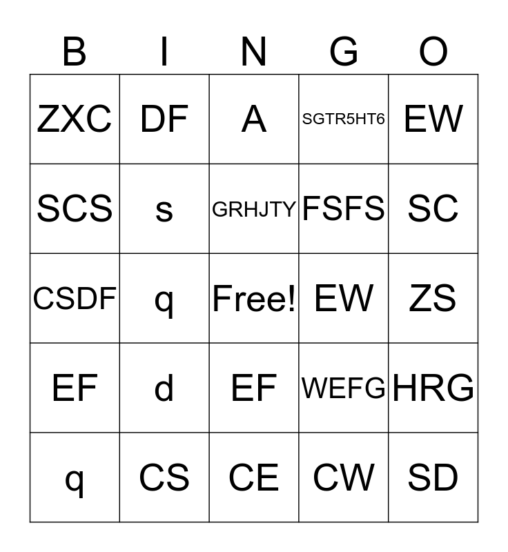 This bingo card has a free space and 29 words: q, q, q, EW, ZXC, A, s, d, EW, CS, ZS, SD, CE, CW, SC, CD, EF, EF, EW, CSDF, WEFG, EFE, FSFS, SCS, SGTR5HT6, DF, HRG, GRHJTY and JGUJT.