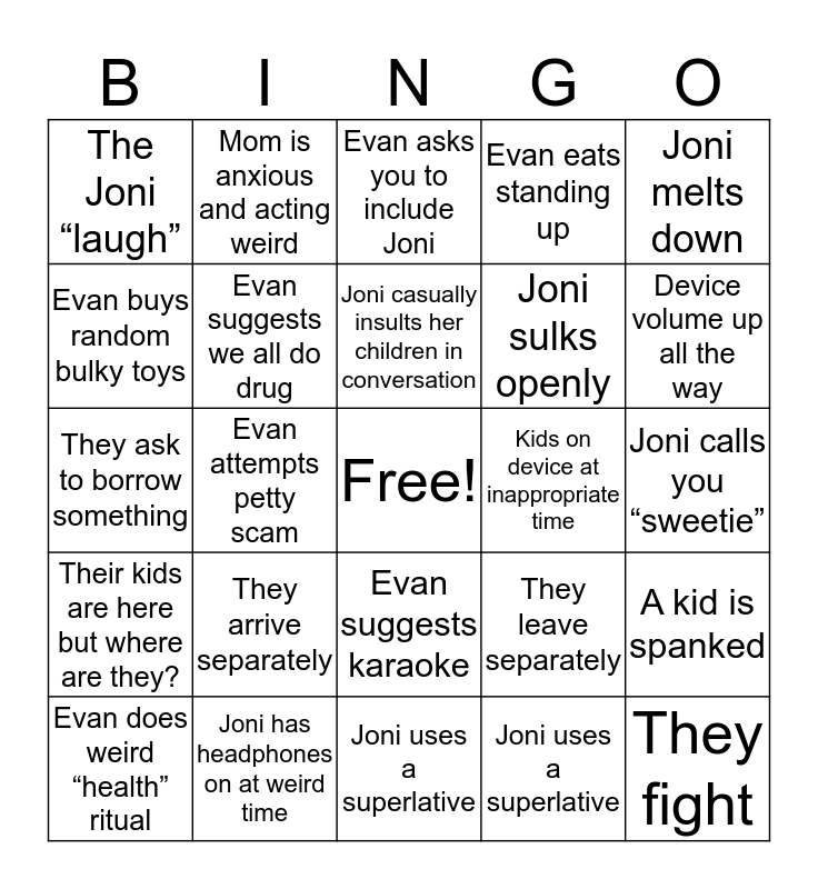 This bingo card has a free space and 24 words: They arrive separately, Joni has headphones on at weird time, Joni casually insults her children in conversation, Evan does weird “health” ritual, Joni melts down, The Joni “laugh”, Evan buys random bulky toys, Mom is anxious and acting weird, Kids on device at inappropriate time, Evan suggests karaoke, Joni sulks openly, They ask to borrow something, They leave separately, A kid is spanked, Evan suggests we all do drug, Joni uses a superlative, Joni calls you “sweetie”, Evan asks you to include Joni, Device volume up all the way, Evan attempts petty scam, They fight, Their kids are here but where are they?, Evan eats standing up and Joni uses a superlative.