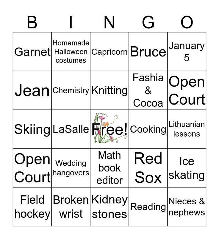 This bingo card has a free space and 35 words: Fred, Westfield, Clark U, Chemistry, Math book editor, Bruce, Jean, John, Knitting, Crocheting, Skiing, January 5, Vale-dictorian, 1940, Garnet, Cooking, Reading, LaSalle, Open Court, Nieces & nephews, Red Sox, Field hockey, Ice skating, Broken wrist, Capricorn, Open Court, Canton, Indian food, Fashia & Cocoa, Lithuanian lessons, Grand-children, Kidney stones, Wedding hangovers, Homemade Halloween costumes and Queen Anne's lace.