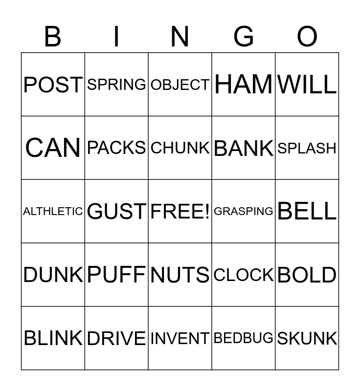 This bingo card has a free space and 24 words: PUFF, DRIVE, CHUNK, BLINK, WILL, POST, CAN, SPRING, GRASPING, NUTS, BANK, ALTHLETIC, CLOCK, BOLD, PACKS, BEDBUG, BELL, OBJECT, SPLASH, GUST, SKUNK, DUNK, HAM and INVENT.
