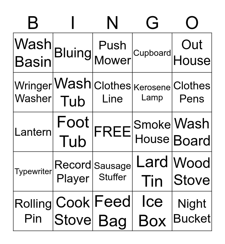 This bingo card has a free space and 24 words: Record Player, Cook Stove, Clothes Line, Rolling Pin, Out House, Wash Basin, Wringer Washer, Bluing, Smoke House, Sausage Stuffer, Kerosene Lamp, Lantern, Lard Tin, Wood Stove, Wash Tub, Ice Box, Wash Board, Push Mower, Clothes Pens, Foot Tub, Night Bucket, Typewriter, Cupboard and Feed Bag.