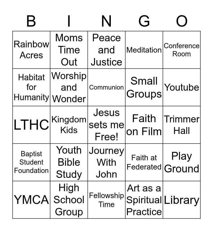 This bingo card has a free space and 49 words: Heads Up Club, Federated Preschool, Heavenly Helpers, Art as a Spiritual Practice, Trimmer Hall, LUM, Moms Time Out, Sunday Worship, Small Groups, Sanctuary, Habitat for Humanity, Kingdom Kids, Faith at Federated, Library, St. Anne's Kitchen, Psalm Oh-Five- Oh, Peace and Justice, Faith on Film, Parlor, Rainbow Acres, High School Group, Fellowship Time, Meditation, Conference Room, Salvation Army, Youth Bible Study, Communion, Men's Coffee, Play Ground, Baptist Student Foundation, Nursery, Journey With John, Women's Book Club, Fish Room, YMCA, Children's Christmas Program, Sermons, Bread and Broth, Youtube, Food Finders, Children's Time, Offering Meditation, Deacon's Lunch, Federated Facebook, LTHC, Worship and Wonder, Sunday Morning Greeters, Federated Stitchers and Federated Website.
