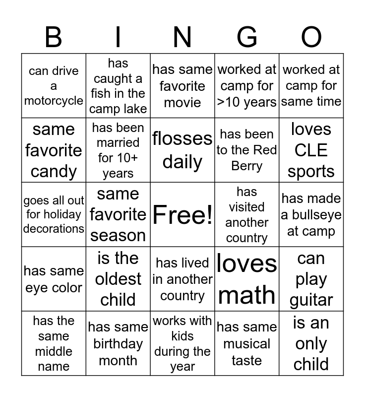 This bingo card has a free space and 44 words: has lived in 3 or more states, is an only child, has more than 4 siblings, has the same middle name, read one of the same books as you, has same musical taste, has same favorite movie, same pet or no pet, worked at camp for same time, has same birthday month, worked at camp for >10 years, has visited another country, has lived in another country, is the oldest child, has a birthday in February, works with kids during the year, does not need glasses / contacts, goes all out for holiday decorations, can whistle a song, loves CLE sports, has caught a fish in the camp lake, has been stuck in an elevator, has met someone famous, can drive a motorcycle, is the youngest child, has made a bullseye at camp, is vegetarian, has slept out by the river, loves math, has same eye color, can sing all lyrics to disney song, can play guitar, is the same height, drove 2+ hours to get here, same favorite season, loves to read, doesn't like seafood, has the same hobby, flosses daily, same favorite candy, has been to the Red Berry, is engaged, has been married for 10+ years and has a tattoo.