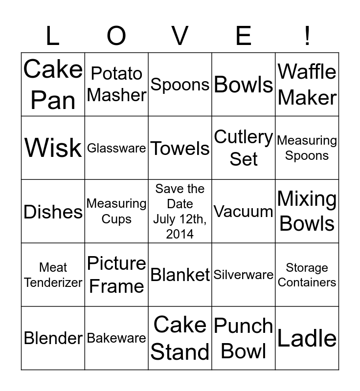 This bingo card has a free space and 24 words: Picture Frame, Bakeware, Towels, Blender, Waffle Maker, Cake Pan, Wisk, Potato Masher, Vacuum, Blanket, Cutlery Set, Dishes, Silverware, Storage Containers, Glassware, Punch Bowl, Mixing Bowls, Spoons, Measuring Spoons, Measuring Cups, Ladle, Meat Tenderizer, Bowls and Cake Stand.