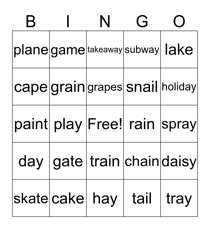 This bingo card has a free space and 24 words: gate, cake, grapes, skate, lake, plane, cape, game, rain, train, snail, paint, chain, daisy, grain, tail, spray, takeaway, holiday, play, tray, day, subway and hay.