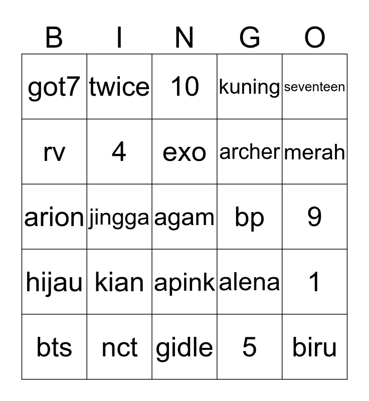 This bingo card has a free space and 24 words: kian, nct, exo, bts, seventeen, got7, rv, twice, bp, apink, archer, arion, alena, 1, 4, 5, 9, 10, merah, jingga, biru, hijau, kuning and gidle.