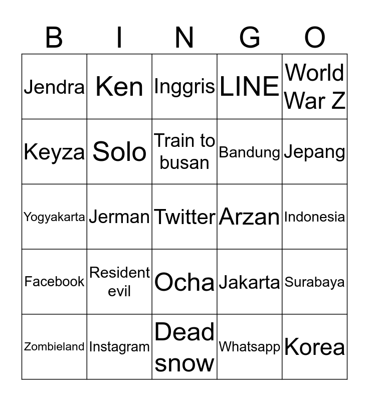 This bingo card has 25 words: Resident evil, Dead snow, Train to busan, Zombieland, World War Z, Jendra, Keyza, Ken, Arzan, Ocha, Bandung, Yogyakarta, Jakarta, Surabaya, Solo, Korea, Indonesia, Inggris, Jepang, Jerman, Twitter, Instagram, Facebook, LINE and Whatsapp.