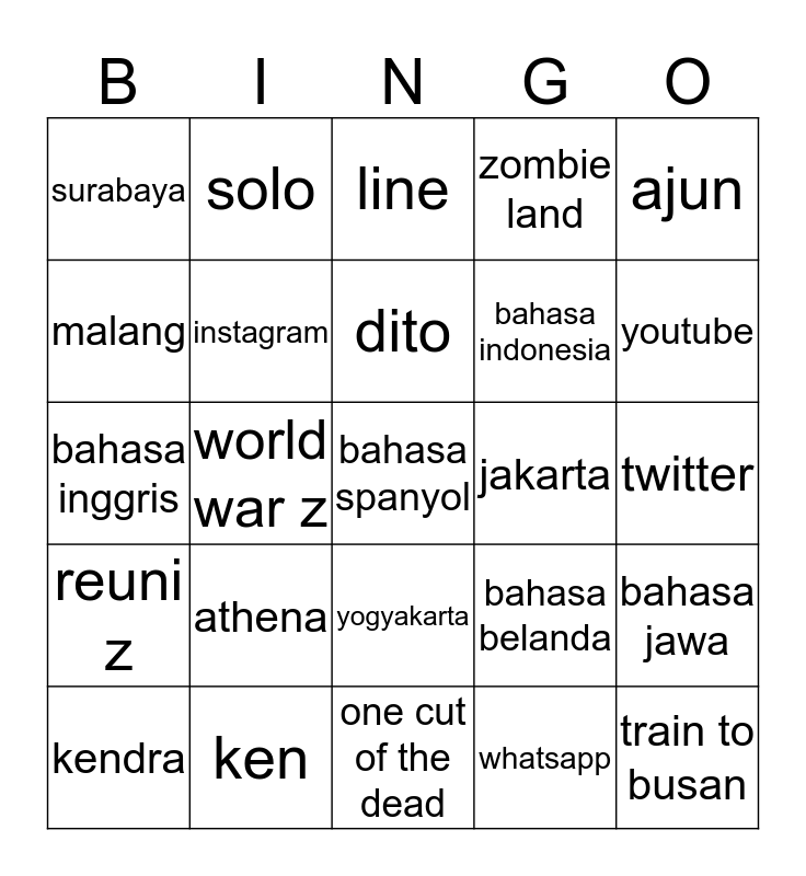 This bingo card has a free space and 24 words: athena, ken, dito, kendra, ajun, surabaya, malang, solo, jakarta, yogyakarta, bahasa indonesia, bahasa inggris, bahasa belanda, bahasa jawa, instagram, whatsapp, twitter, line, youtube, world war z, train to busan, reuni z, zombie land and one cut of the dead.