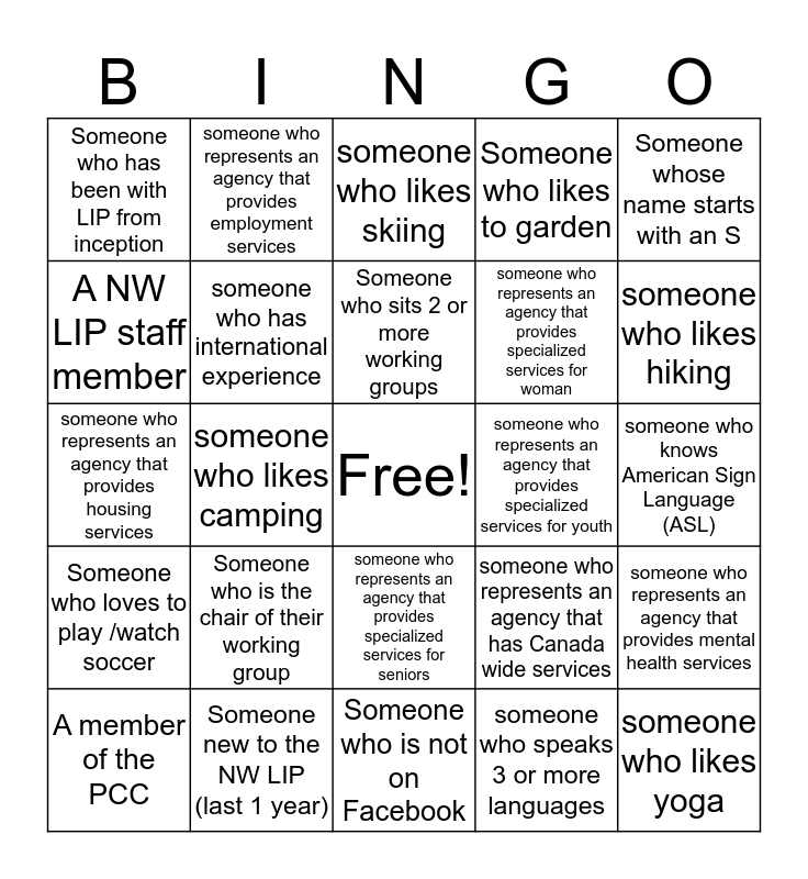 This bingo card has a free space and 24 words: Someone who is the chair of their working group, Someone new to the NW LIP (last 1 year), Someone who sits 2 or more working groups, A member of the PCC, Someone whose name starts with an S, Someone who has been with LIP from inception, A NW LIP staff member, someone who represents an agency that provides employment services, someone who represents an agency that provides specialized services for youth, someone who represents an agency that provides specialized services for seniors, someone who represents an agency that provides specialized services for woman, someone who represents an agency that provides housing services, someone who represents an agency that has Canada wide services, someone who represents an agency that provides mental health services, someone who has international experience, someone who speaks 3 or more languages, someone who knows American Sign Language (ASL), someone who likes skiing, someone who likes hiking, someone who likes camping, someone who likes yoga, Someone who loves to play /watch soccer, Someone who likes to garden and Someone who is not on Facebook.