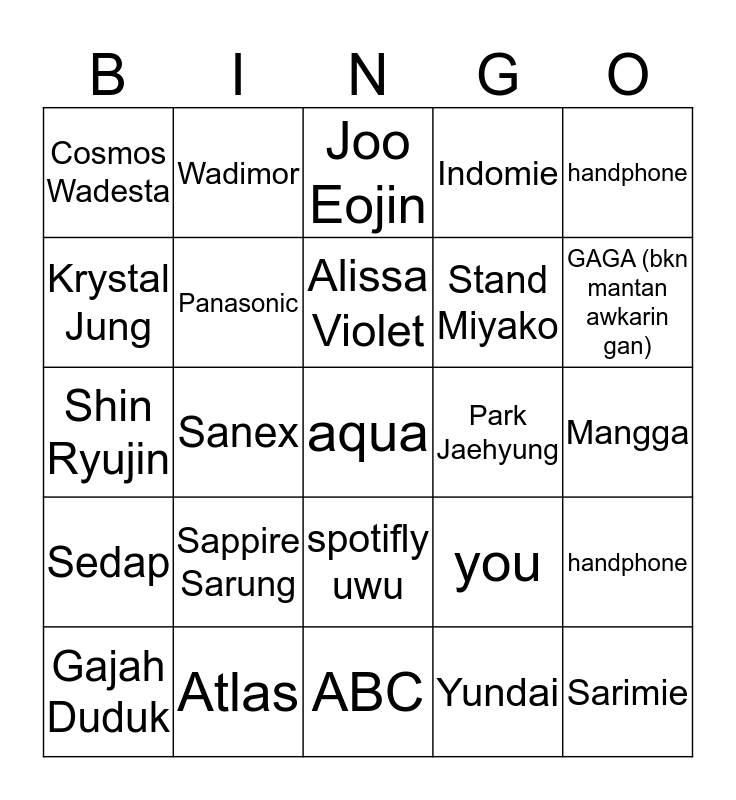 This bingo card has a free space and 24 words: Sappire Sarung, Atlas, Alissa Violet, Gajah Duduk, handphone, Cosmos Wadesta, Krystal Jung, Wadimor, Park Jaehyung, spotifly uwu, Stand Miyako, Shin Ryujin, you, handphone, Panasonic, Yundai, Mangga, Joo Eojin, GAGA (bkn mantan awkarin gan), Sanex, Sarimie, Sedap, Indomie and ABC.