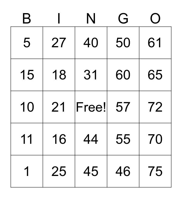 This bingo card has a free space and 24 words: 1, 16, 31, 46, 61, 5, 27, 40, 57, 72, 10, 18, 55, 70, 15, 25, 45, 50, 65, 11, 21, 44, 60 and 75.