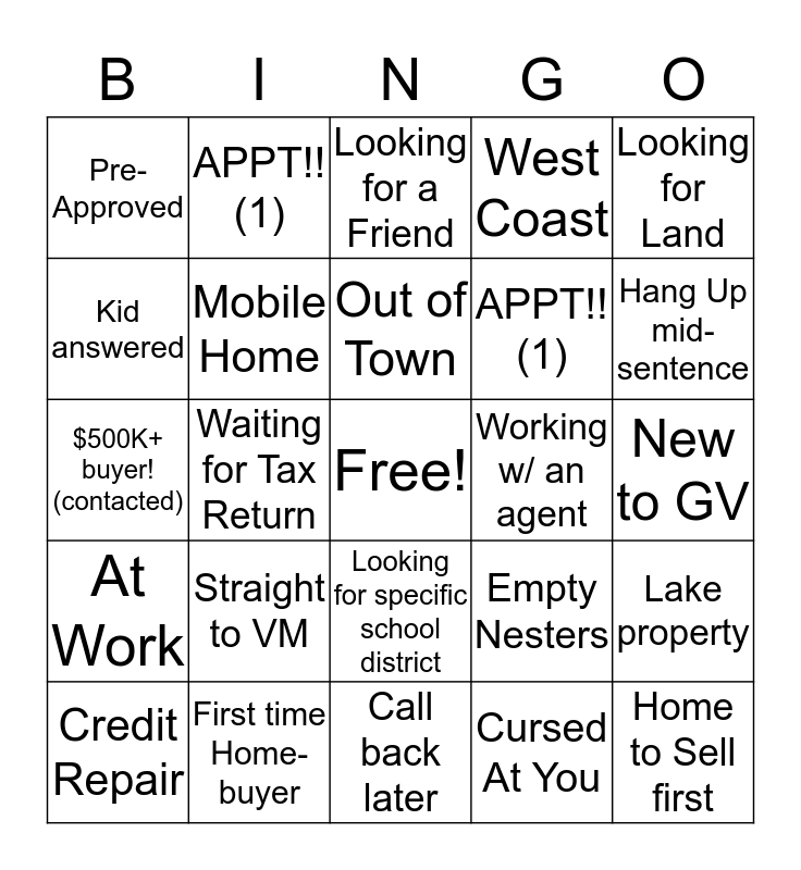This bingo card has a free space and 24 words: Credit Repair, Straight to VM, Out of Town, Cursed At You, Looking for Land, Pre-Approved, APPT!! (1), Looking for a Friend, Working w/ an agent, New to GV, $500K+ buyer! (contacted), Mobile Home, Empty Nesters, Lake property, Kid answered, First time Home-buyer, Call back later, West Coast, Hang Up mid-sentence, At Work, Waiting for Tax Return, Looking for specific school district, APPT!! (1) and Home to Sell first.