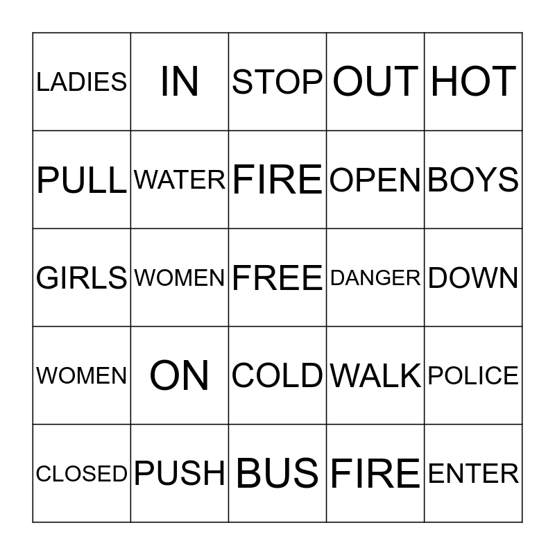 This bingo card has a free space and 24 words: ON, PUSH, FIRE, CLOSED, HOT, LADIES, PULL, IN, DANGER, COLD, OPEN, GIRLS, WALK, POLICE, WATER, FIRE, DOWN, STOP, BOYS, WOMEN, ENTER, WOMEN, OUT and BUS.