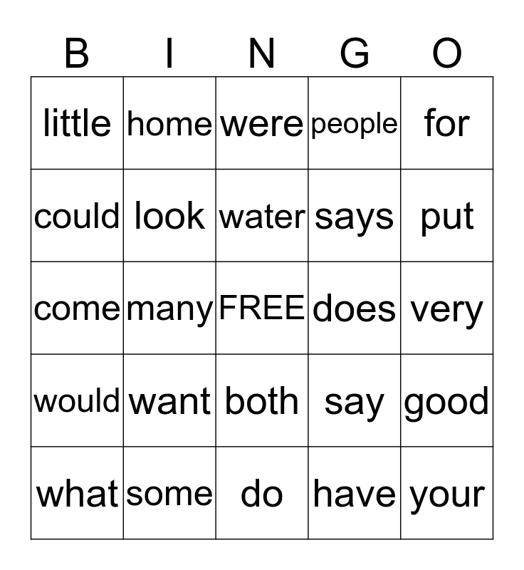 This bingo card has a free space and 37 words: make, there, be, look, good, want, water, from, for, again, many, people, your, very, could, would, should, were, both, does, little, put, what, do, like, have, home, said, of, her, his, some, come, out, say, says and so.