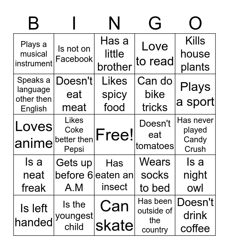 This bingo card has a free space and 24 words: Is left handed, Gets up before 6 A.M, Likes spicy food, Has been outside of the country, Kills house plants, Plays a musical instrument, Is not on Facebook, Has a little brother, Doesn't eat tomatoes, Has never played Candy Crush, Loves anime, Doesn't eat meat, Wears socks to bed, Is a night owl, Speaks a language other then English, Is the youngest child, Can skate, Love to read, Plays a sport, Is a neat freak, Likes Coke better then Pepsi, Has eaten an insect, Can do bike tricks and Doesn't drink coffee.