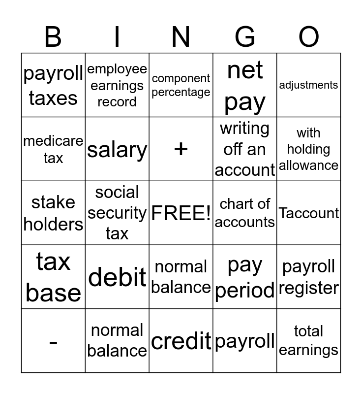 This bingo card has a free space and 24 words: debit, normal balance, +, -, adjustments, payroll taxes, medicare tax, employee earnings record, chart of accounts, normal balance, writing off an account, stake holders, pay period, payroll register, salary, payroll, Taccount, component percentage, with holding allowance, social security tax, total earnings, tax base, net pay and credit.