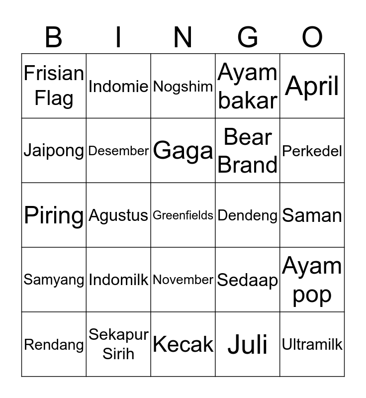 This bingo card has 25 words: Indomilk, Kecak, Gaga, Rendang, April, Frisian Flag, Jaipong, Indomie, Dendeng, November, Bear Brand, Piring, Sedaap, Ayam pop, Desember, Ultramilk, Saman, Nogshim, Perkedel, Agustus, Greenfields, Sekapur Sirih, Samyang, Ayam bakar and Juli.