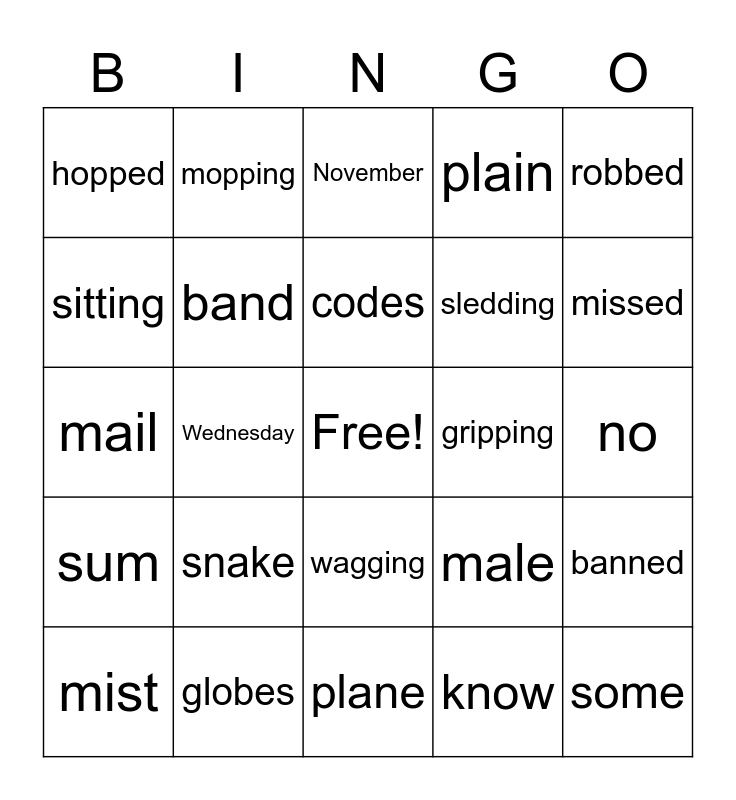 This bingo card has a free space and 24 words: snake, globes, codes, mist, robbed, hopped, sitting, mopping, gripping, wagging, sledding, mail, male, banned, band, know, no, November, missed, Wednesday, some, sum, plain and plane.