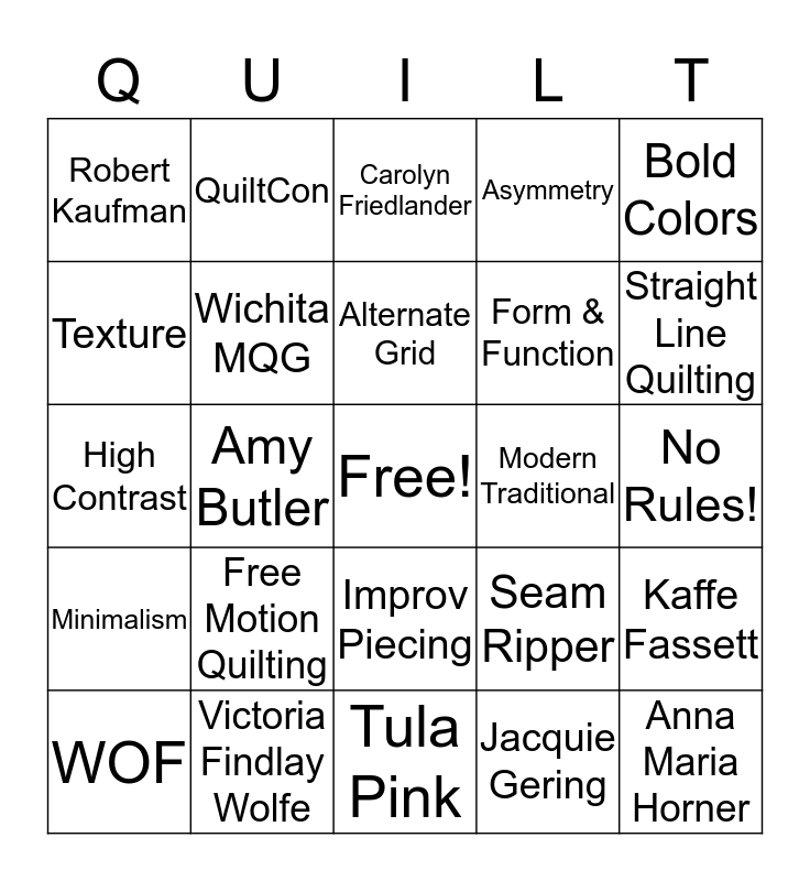 This bingo card has a free space and 34 words: Negative Space, Jacquie Gering, Fat Quarter, Cotton + Steel, Minimalism, Wichita MQG, Bold Colors, WOF, QuiltCon, 1/4" Seam, Alternate Grid, Carolyn Friedlander, Solid Fabric, Denyse Schmidt, Modern Traditional, Straight Line Quilting, Victoria Findlay Wolfe, High Contrast, Free Motion Quilting, Seam Ripper, Improv Piecing, HST, Robert Kaufman, No Rules!, Tula Pink, Anna Maria Horner, Asymmetry, Narrow Binding, Form & Function, Texture, Pixelization, Amy Butler, Kaffe Fassett and No Borders.