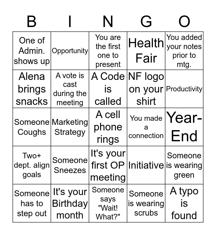 This bingo card has a free space and 24 words: Someone Sneezes, It's your Birthday month, A Code is called, Someone has to step out, You added your notes prior to mtg., One of Admin. shows up, Alena brings snacks, Opportunity, You made a connection, It's your first OP meeting, NF logo on your shirt, Someone Coughs, Initiative, Someone is wearing green, A vote is cast during the meeting, Someone is wearing scrubs, Year-End, You are the first one to present, Productivity, Marketing Strategy, A typo is found, Two+ dept. align goals, Health Fair and Someone says "Wait! What?".