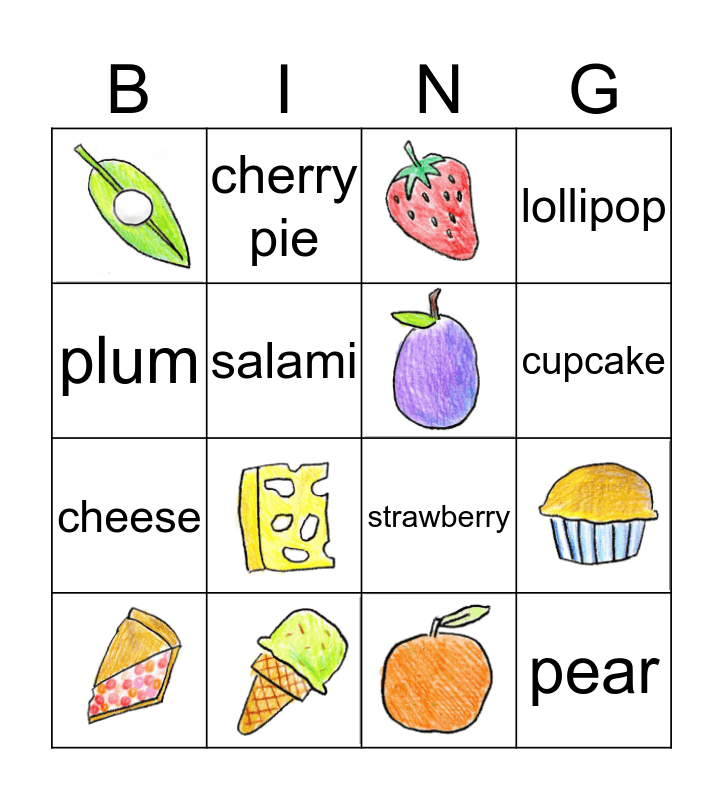 This bingo card has 16 images and 13 words: apple, pear, plum, strawberry, chocolate cake, ice-cream, cheese, salami, lollipop, cherry pie, sausage, cupcake and watermelon.