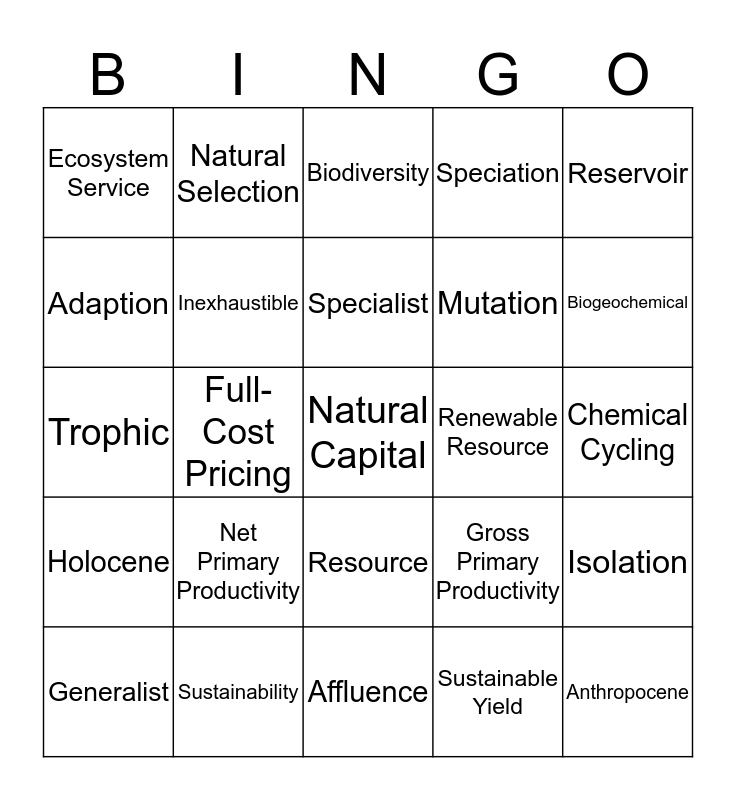 This bingo card has 30 words: Sustainability, Ecological Footprint, Full-Cost Pricing, Win-Win Solution, Ecosystem Service, Biodiversity, Inexhaustible, Resource, Renewable Resource, Affluence, Chemical Cycling, Natural Capital, Sustainable Yield, Anthropocene, Biogeochemical, Biomass, Gross Primary Productivity, Holocene, Net Primary Productivity, Reservoir, Trophic, Evolution, Natural Selection, Mutation, Adaption, Speciation, Isolation, Generalist, Specialist and Native.