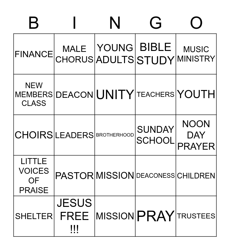 This bingo card has a free space and 24 words: PASTOR, JESUS FREE !!!, UNITY, SHELTER, MUSIC MINISTRY, FINANCE, NEW MEMBERS CLASS, MALE CHORUS, SUNDAY SCHOOL, MISSION, TEACHERS, CHOIRS, DEACONESS, CHILDREN, DEACON, PRAY, NOON DAY PRAYER, YOUNG ADULTS, YOUTH, LEADERS, TRUSTEES, LITTLE VOICES OF PRAISE, BIBLE STUDY and MISSION.