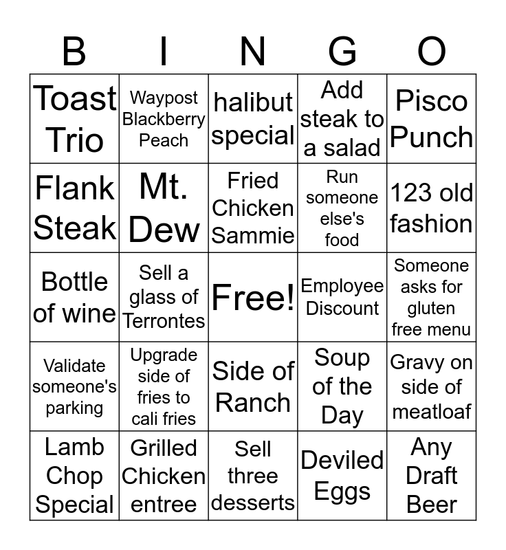 This bingo card has a free space and 24 words: Upgrade side of fries to cali fries, Grilled Chicken entree, Fried Chicken Sammie, Lamb Chop Special, Pisco Punch, Toast Trio, Flank Steak, Waypost Blackberry Peach, Employee Discount, Side of Ranch, Run someone else's food, Bottle of wine, Soup of the Day, Gravy on side of meatloaf, Mt. Dew, Deviled Eggs, Someone asks for gluten free menu, halibut special, 123 old fashion, Sell a glass of Terrontes, Any Draft Beer, Validate someone's parking, Add steak to a salad and Sell three desserts.