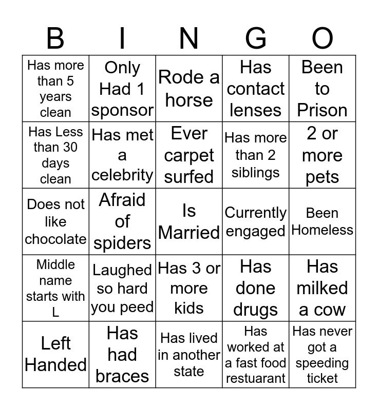 This bingo card has 25 words: Laughed so hard you peed, Has lived in another state, Ever carpet surfed, Left Handed, Been to Prison, Has more than 5 years clean, Has Less than 30 days clean, Only Had 1 sponsor, Currently engaged, Has 3 or more kids, Has more than 2 siblings, Does not like chocolate, Has done drugs, Has milked a cow, Has met a celebrity, Has never got a speeding ticket, Been Homeless, Rode a horse, 2 or more pets, Afraid of spiders, Is Married, Has had braces, Middle name starts with L, Has contact lenses and Has worked at a fast food restuarant.