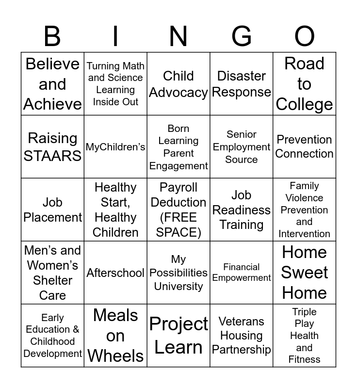 This bingo card has a free space and 25 words: Afterschool, Project Learn, Born Learning Parent Engagement, Early Education & Childhood Development, Road to College, Believe and Achieve, Raising STAARS, Turning Math and Science Learning Inside Out, Job Readiness Training, My Possibilities University, Senior Employment Source, Job Placement, Financial Empowerment, Home Sweet Home, MyChildren’s, Preventative Care/Healthy Kids, Family Violence Prevention and Intervention, Child Advocacy, Prevention Connection, Healthy Start, Healthy Children, Triple Play Health and Fitness, Meals on Wheels, Men’s and Women’s Shelter Care, Disaster Response and Veterans Housing Partnership.