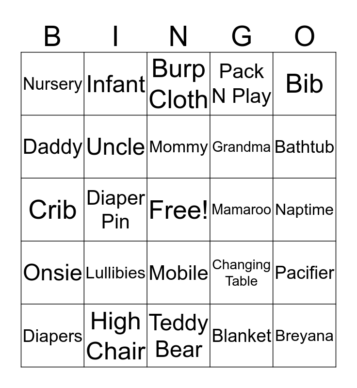 This bingo card has a free space and 43 words: Jamal, Breyana, Alayah, Diapers, Diaper Cream, Blanket, Burp Cloth, Washcloth, Bib, High Chair, Pack N Play, Mamaroo, Mobile, Lullibies, Nursery Rhymes, Teddy Bear, Duck, Crib, Crib Sheets, Bathtub, Infant, Stroller, Carseat, Nursery, Daycare, Naptime, Bottle, Formula, Changing Table, Onsie, Booties, Pacifier, Cradle, Diaper Pin, Bassinet, Bouncer, Toys, Mommy, Daddy, Grandma, Aunt, Uncle and Romper.