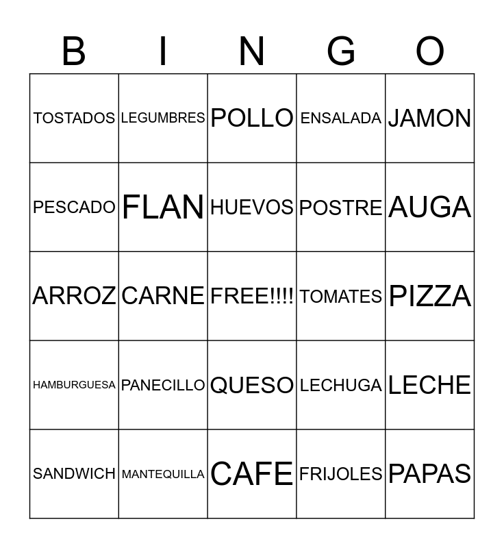 This bingo card has a free space and 24 words: PANECILLO, MANTEQUILLA, HUEVOS, SANDWICH, JAMON, TOSTADOS, PESCADO, LEGUMBRES, TOMATES, QUESO, POSTRE, ARROZ, LECHUGA, LECHE, FLAN, FRIJOLES, PIZZA, POLLO, AUGA, CARNE, PAPAS, HAMBURGUESA, ENSALADA and CAFE.