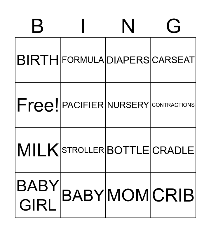 This bingo card has 16 words: BABY, CRADLE, DIAPERS, BIRTH, MILK, FORMULA, BOTTLE, MOM, Free!, PACIFIER, BABY GIRL, CARSEAT, STROLLER, CONTRACTIONS, NURSERY and CRIB.