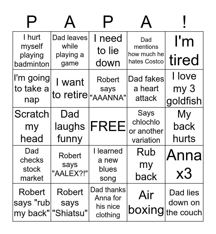 This bingo card has a free space and 24 words: Robert says "AALEX?!", Robert says "Shiatsu", Robert says "AAANNA", Robert says "rub my back", I'm tired, I hurt myself playing badminton, I'm going to take a nap, Dad leaves while playing a game, Says chlochlo or another variation, I learned a new blues song, Dad fakes a heart attack, Scratch my head, Rub my back, Anna x3, I want to retire, Air boxing, My back hurts, I need to lie down, I love my 3 goldfish, Dad laughs funny, Dad lies down on the couch, Dad checks stock market, Dad mentions how much he hates Costco and Dad thanks Anna for his nice clothing.