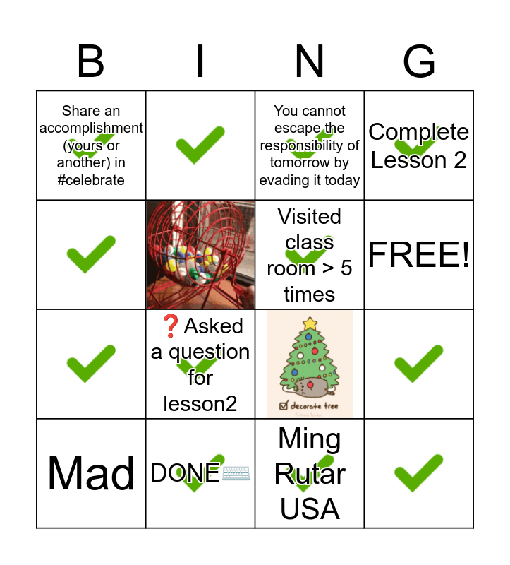 This bingo card has 15 images and 10 words: Ming Rutar USA, Mad, You cannot escape the responsibility of tomorrow by evading it today, Share an accomplishment (yours or another) in #celebrate, ❓Asked a question for lesson2, Complete Lesson 2, Visited class room > 5 times, FREE!, DONE⌨️ and Get to know a Student Leader!.