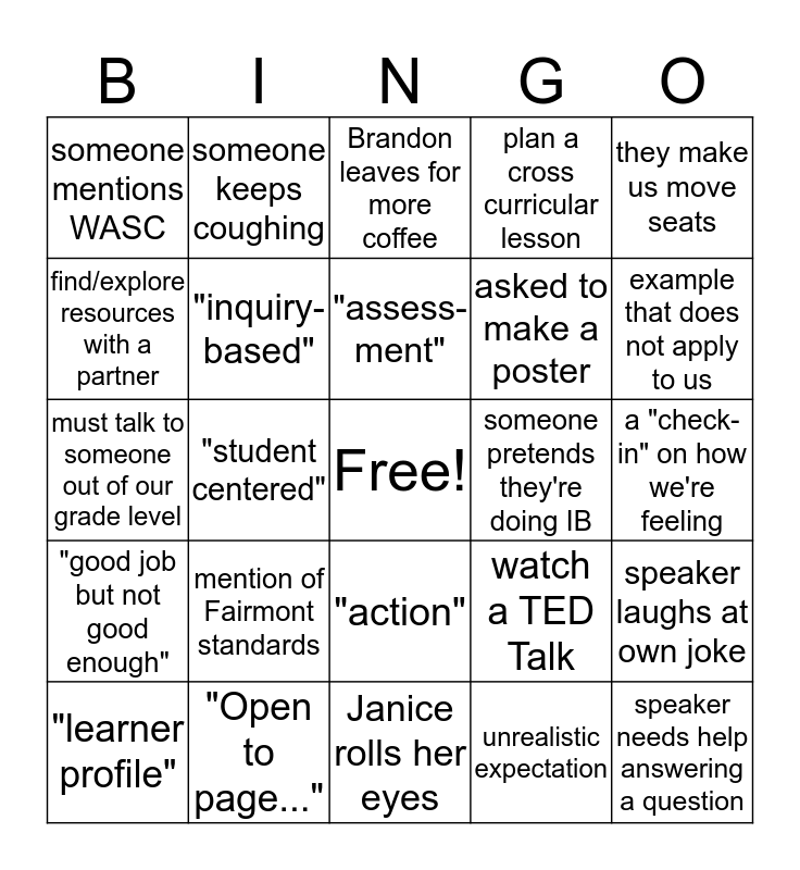 This bingo card has a free space and 29 words: "learner profile", forced to do an icebreaker, "student centered", "global perspec-tive", someone mentions WASC, Brandon leaves for more coffee, "inquiry-based", mention of Fairmont standards, someone pretends they're doing IB, "Open to page...", a "check-in" on how we're feeling, speaker needs help answering a question, Janice rolls her eyes, unrealistic expectation, example that does not apply to us, Lisa plays on her phone, "action", "good job but not good enough", they make us move seats, must talk to someone out of our grade level, watch a TED Talk, asked to apply a new strategy, asked to make a poster, find/explore resources with a partner, plan a cross curricular lesson, someone keeps coughing, speaker laughs at own joke, "assess-ment" and more added on to our daily tasks.