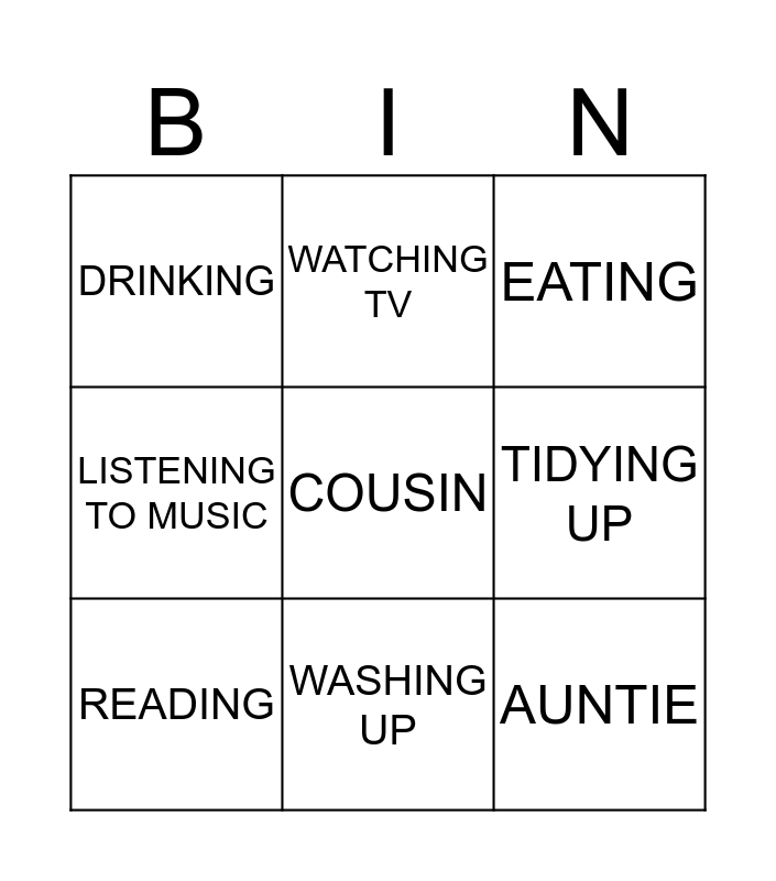 This bingo card has a free space and 9 words: READING, EATING, WATCHING TV, LISTENING TO MUSIC, DRINKING, TIDYING UP, AUNTIE, UNCLE and WASHING UP.