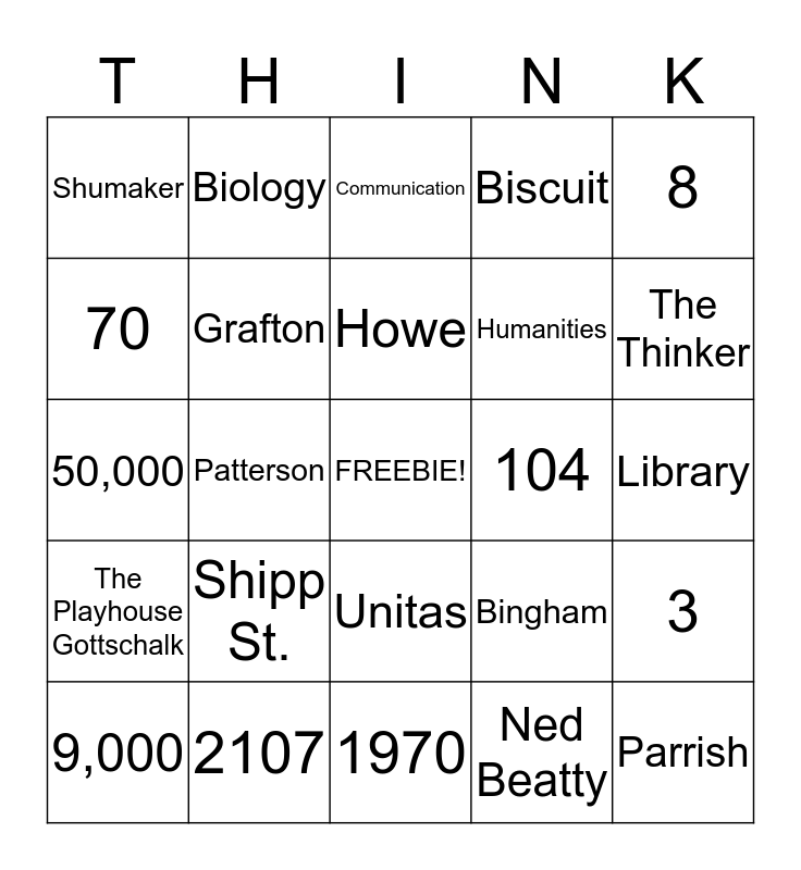 This bingo card has a free space and 28 words: 3, 1907, Humanities, Ned Beatty, 70, Communication, Biology, The Playhouse Gottschalk, 104, 9,000, 50,000, Biscuit, 2107, 1970, The Thinker, Miller IT, Shipp St., Grafton, Howe, Unitas, Shumaker, Flood, Parrish, Patterson, Library, Bingham, 8 and The White Squirrel Gardiner Hall.
