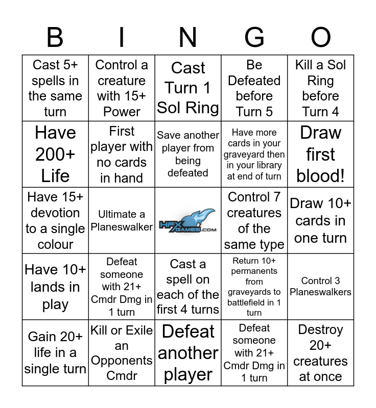 This bingo card has a free space and 25 words: Defeat someone with 21+ Cmdr Dmg in 1 turn, Defeat another player, Save another player from being defeated, Gain 20+ life in a single turn, Kill a Sol Ring before Turn 4, Cast 5+ spells in the same turn, Have 200+ Life, Control a creature with 15+ Power, Control 7 creatures of the same type, Cast a spell on each of the first 4 turns, Have more cards in your graveyard then in your library at end of turn, Have 15+ devotion to a single colour, Return 10+ permanents from graveyards to battlefield in 1 turn, Control 3 Planeswalkers, First player with no cards in hand, Play your Cmdr 5 times in one game, Draw 10+ cards in one turn, Cast Turn 1 Sol Ring, Draw first blood!, Ultimate a Planeswalker, Destroy 20+ creatures at once, Kill or Exile an Opponents Cmdr, Have 10+ lands in play, Be Defeated before Turn 5 and Defeat someone with 21+ Cmdr Dmg in 1 turn.
