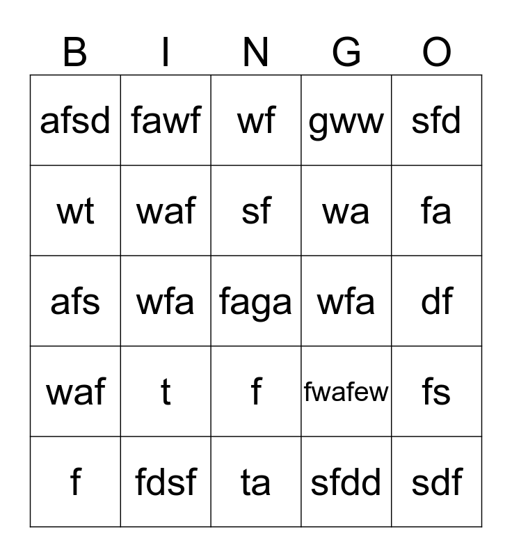 This bingo card has 25 words: t, ta, sf, f, sfd, afsd, wt, fawf, wfa, f, wa, afs, fwafew, fs, waf, sdf, df, wf, fa, wfa, faga, fdsf, waf, gww and sfdd.