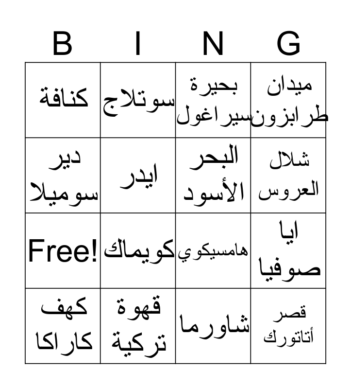 This bingo card has 20 words: ايا صوفيا, ازنغول, بحيرة سيراغول, شاي تركي, كهف كاراكا, دير سوميلا, قهوة تركية, كنافة, Free!, سوتلاج, كويماك, هامسيكوي, ايدر, قصر أتاتورك, البحر الأسود, نهر فارتيني دارسي, شلال العروس, ميدان طرابزون, شاورما and تانتوني.