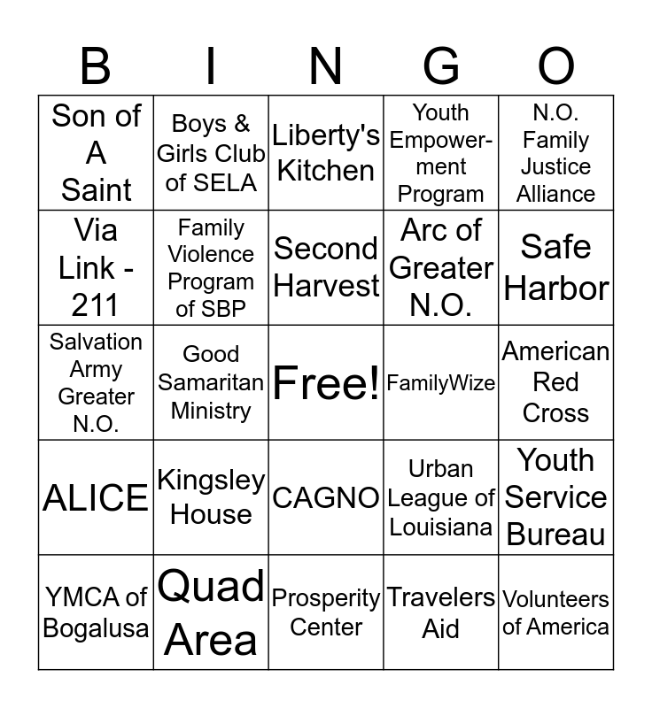 This bingo card has a free space and 24 words: Kingsley House, Quad Area, Second Harvest, YMCA of Bogalusa, N.O. Family Justice Alliance, Son of A Saint, Via Link - 211, Boys & Girls Club of SELA, FamilyWize, CAGNO, Arc of Greater N.O., Salvation Army Greater N.O., Urban League of Louisiana, Youth Service Bureau, Family Violence Program of SBP, Travelers Aid, American Red Cross, Liberty's Kitchen, Safe Harbor, Good Samaritan Ministry, Volunteers of America, ALICE, Youth Empower-ment Program and Prosperity Center.