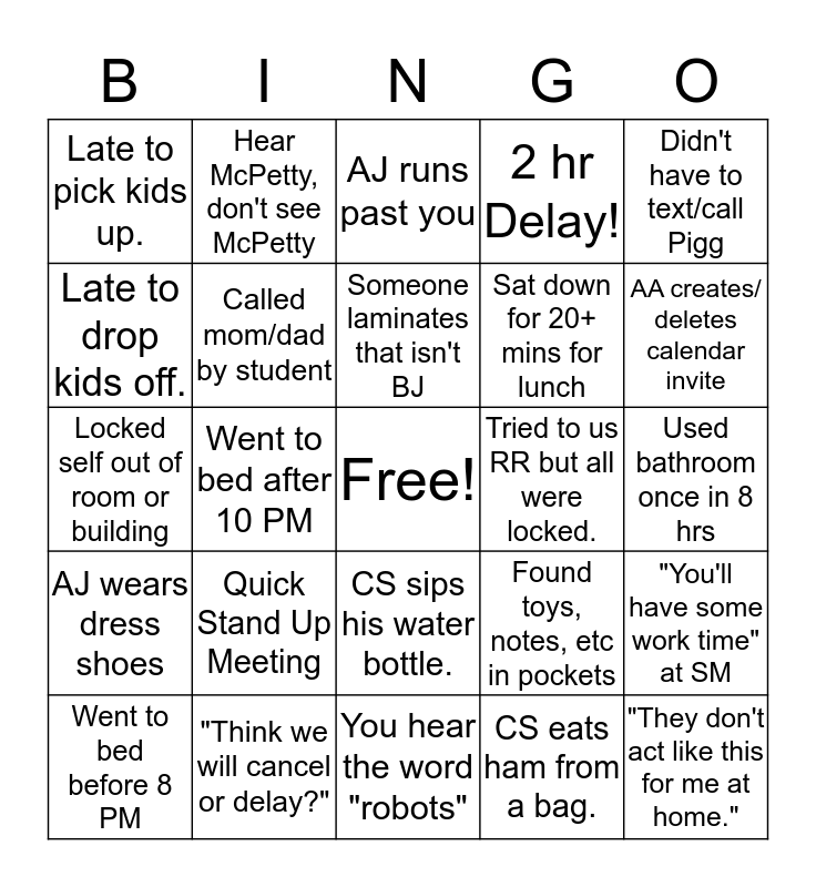 This bingo card has a free space and 26 words: CS sips his water bottle., CS eats ham from a bag., Someone laminates that isn't BJ, "Think we will cancel or delay?", Didn't have to text/call Pigg, Late to pick kids up., Late to drop kids off., Hear McPetty, don't see McPetty, Used bathroom once in 8 hrs, Found toys, notes, etc in pockets, Sat down for 20+ mins for lunch, Locked self out of room or building, "You'll have some work time" at SM, Went to bed before 8 PM, Went to bed after 10 PM, Snow Day!, 2 hr Delay!, AJ wears dress shoes, AJ runs past you, "They don't act like this for me at home.", AA creates/ deletes calendar invite, You hear the word "robots", Tried to us RR but all were locked., Quick Stand Up Meeting, Called mom/dad by student and Steal food from Cafe.