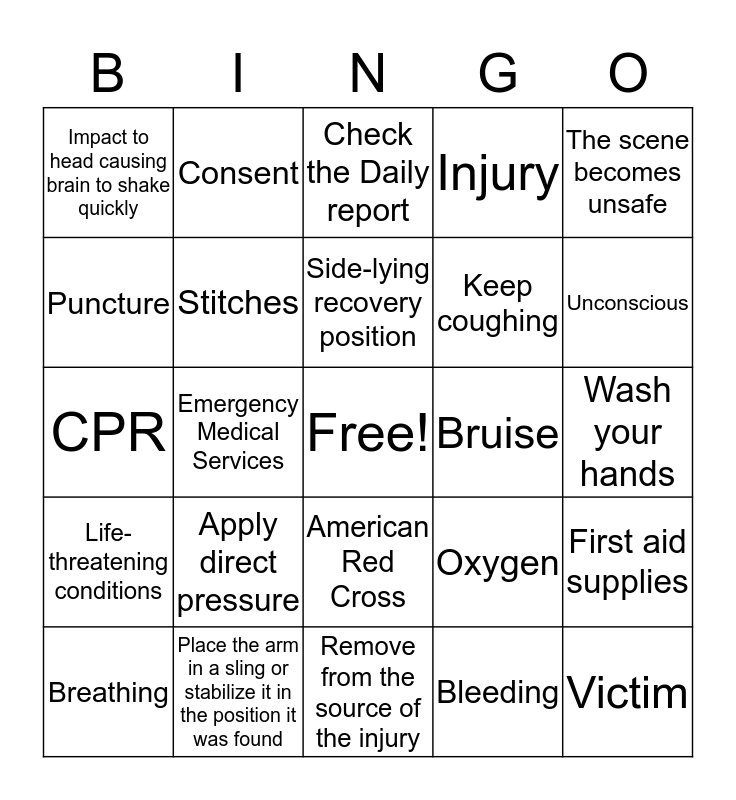 This bingo card has a free space and 24 words: Apply direct pressure, Place the arm in a sling or stabilize it in the position it was found, Side-lying recovery position, Breathing, The scene becomes unsafe, Impact to head causing brain to shake quickly, Puncture, Consent, Bruise, American Red Cross, Keep coughing, CPR, Oxygen, First aid supplies, Stitches, Bleeding, Wash your hands, Check the Daily report, Unconscious, Emergency Medical Services, Victim, Life-threatening conditions, Injury and Remove from the source of the injury.