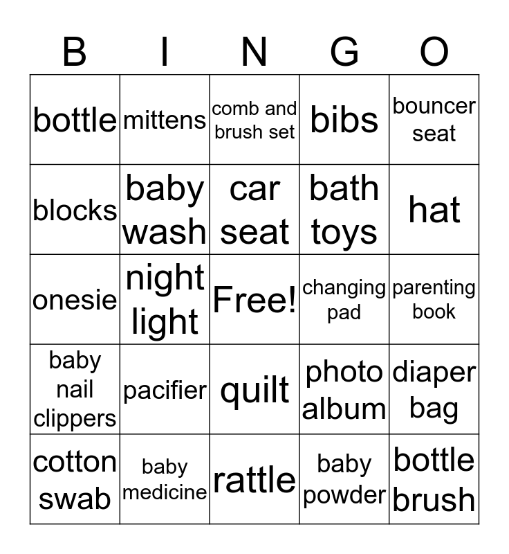 This bingo card has a free space and 61 words: activity gym, baby medicine, baby monitor, baby nail clippers, baby powder, baby spoon, baby wash, bath mat, bath toys, bath tub, bibs, blanket, blocks, board book, booties, bottle, bottle brush, bouncer seat, burp cloths, car seat, changing pad, comb and brush set, cotton swab, diaper bag, diaper cream, diapers, gift card, hangers, hat, high chair, hooded towel, laundry soap, lotion, mattress cover, mittens, musical toy, nasal aspirator, night light, nursery décor, onesie, outlet plugs, pacifier, parenting book, petroleum jelly, photo album, picture frame, piggy bank, plates/bowls, potty chair, quilt, rattle, sheet, sleeper, socks, stroller, swaddle blanket, teddy bear, teething ring, thermometer, wash cloth and wipes.