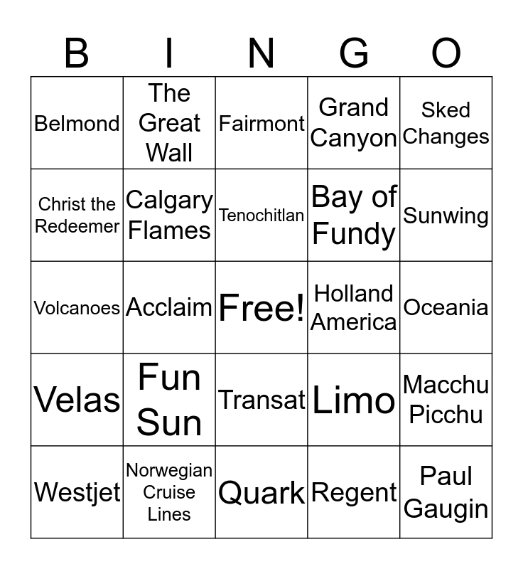 This bingo card has a free space and 29 words: Westjet, Air Canada, Acclaim, Bedsonline, Belmond, Fairmont, Calgary Flames, Fun Sun, Holland America, Norwegian Cruise Lines, Oceania, Paul Gaugin, Quark, Regent, Sunwing, Tauck, Transat, Velas, Sked Changes, Volcanoes, Limo, Grand Canyon, Bay of Fundy, Christ the Redeemer, Grand Canyon, The Great Wall, Macchu Picchu, Tenochitlan and Gary, Indiana.
