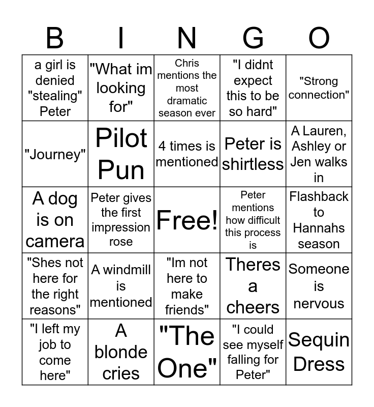 This bingo card has a free space and 29 words: "I left my job to come here", Someone gets drunk, Peter gives the first impression rose, Peter is "stolen", a girl is denied "stealing" Peter, Chris mentions the most dramatic season ever, Pilot Pun, A windmill is mentioned, Peter mentions how difficult this process is, A blonde cries, Flashback to Hannahs season, Sequin Dress, "The One", "I could see myself falling for Peter", A Lauren, Ashley or Jen walks in, Someone is embarrassed, "Im not here to make friends", "Shes not here for the right reasons", "Strong connection", A dog is on camera, Theres a cheers, Single mom, Peter is shirtless, "Journey", "I didnt expect this to be so hard", "What im looking for", Someone is nervous, 4 times is mentioned and someone is seen looking into the distance.
